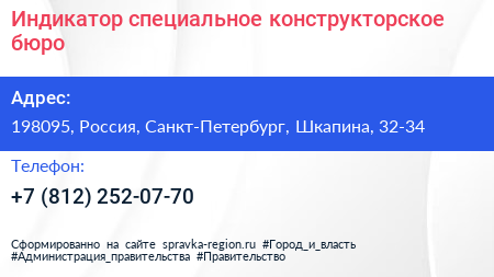 Индикатор, специальное конструкторское бюро по адресу 198095, Россия, Санкт-Петербург, Шкапина, 32-34 в дальнейшем Организация, размещена в следующих категориях: