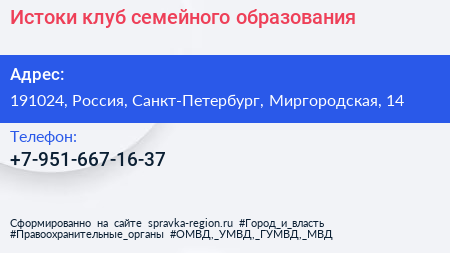Истоки, клуб семейного образования по адресу 191024, Россия, Санкт-Петербург, Миргородская, 14 в дальнейшем Организация, размещена в следующих категориях: