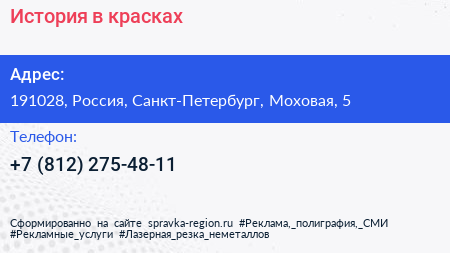 История в красках по адресу 191028, Россия, Санкт-Петербург, Моховая, 5 в дальнейшем Организация, размещена в следующих категориях: