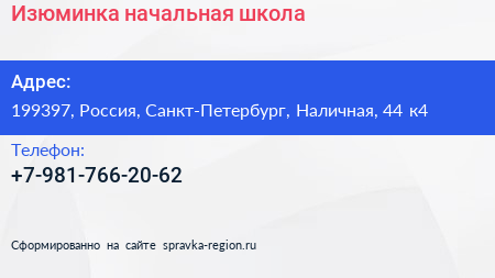 Изюминка, начальная школа по адресу 199397, Россия, Санкт-Петербург, Наличная, 44 к4 в дальнейшем Организация, размещена в следующих категориях: