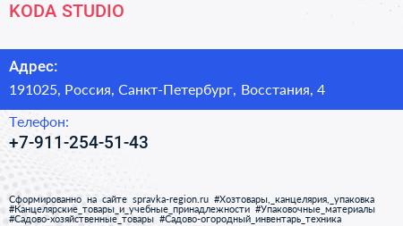 KODA STUDIO по адресу 191025, Россия, Санкт-Петербург, Восстания, 4 в дальнейшем Организация, размещена в следующих категориях:
