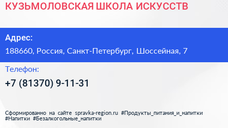 КУЗЬМОЛОВСКАЯ ШКОЛА ИСКУССТВ по адресу 188660, Россия, Санкт-Петербург, Шоссейная, 7 в дальнейшем Организация, размещена в следующих категориях: