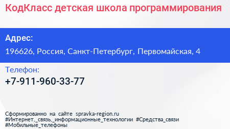 КодКласс, детская школа программирования по адресу 196626, Россия, Санкт-Петербург, Первомайская, 4 в дальнейшем Организация, размещена в следующих категориях: