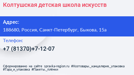 Колтушская детская школа искусств по адресу 188680, Россия, Санкт-Петербург, Быкова, 15а в дальнейшем Организация, размещена в следующих категориях: