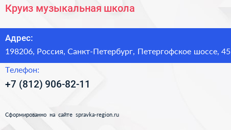Круиз, музыкальная школа по адресу 198206, Россия, Санкт-Петербург, Петергофское шоссе, 45 в дальнейшем Организация, размещена в следующих категориях: