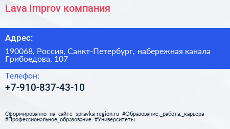 Lava Improv, компания по адресу 190068, Россия, Санкт-Петербург, набережная канала Грибоедова, 107 в дальнейшем Организация, размещена в следующих категориях:
