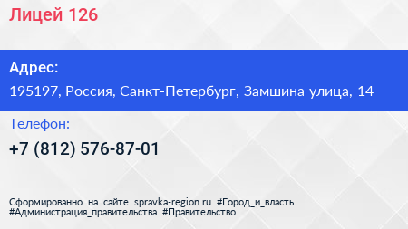 Лицей №126 по адресу 195197, Россия, Санкт-Петербург, Замшина улица, 14 в дальнейшем Организация, размещена в следующих категориях: