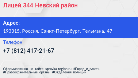 Лицей №344, Невский район по адресу 193315, Россия, Санкт-Петербург, Тельмана, 47 в дальнейшем Организация, размещена в следующих категориях: