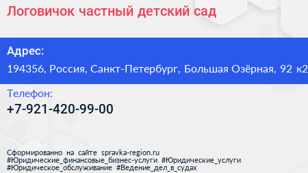 Логовичок, частный детский сад по адресу 194356, Россия, Санкт-Петербург, Большая Озёрная, 92 к2 в дальнейшем Организация, размещена в следующих категориях:
