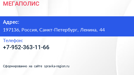 МЕГАПОЛИС по адресу 197136, Россия, Санкт-Петербург, Ленина, 44 в дальнейшем Организация, размещена в следующих категориях: