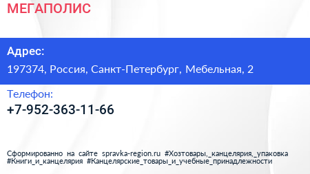 МЕГАПОЛИС по адресу 197374, Россия, Санкт-Петербург, Мебельная, 2 в дальнейшем Организация, размещена в следующих категориях: