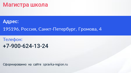 Магистра, школа по адресу 195196, Россия, Санкт-Петербург, Громова, 4 в дальнейшем Организация, размещена в следующих категориях: