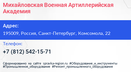 Михайловская Военная Артиллерийская Академия по адресу 195009, Россия, Санкт-Петербург, Комсомола, 22 в дальнейшем Организация, размещена в следующих категориях: