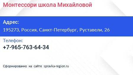 Монтессори-школа Михайловой по адресу 195273, Россия, Санкт-Петербург, Руставели, 26 в дальнейшем Организация, размещена в следующих категориях: