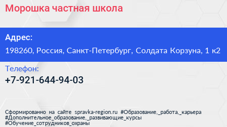 Морошка, частная школа по адресу 198260, Россия, Санкт-Петербург, Солдата Корзуна, 1 к2 в дальнейшем Организация, размещена в следующих категориях: