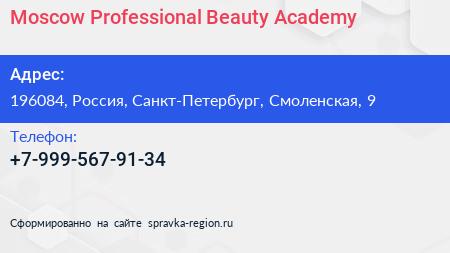 Moscow Professional Beauty Academy по адресу 196084, Россия, Санкт-Петербург, Смоленская, 9 в дальнейшем Организация, размещена в следующих категориях:
