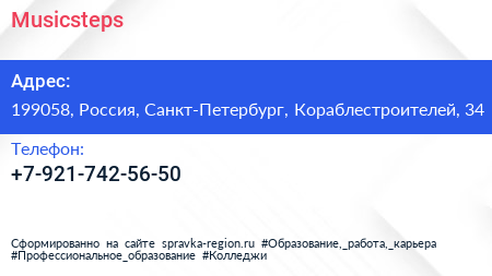 Musicsteps по адресу 199058, Россия, Санкт-Петербург, Кораблестроителей, 34 в дальнейшем Организация, размещена в следующих категориях:
