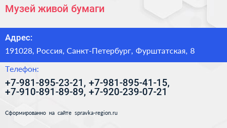 Музей живой бумаги по адресу 191028, Россия, Санкт-Петербург, Фурштатская, 8 в дальнейшем Организация, размещена в следующих категориях: