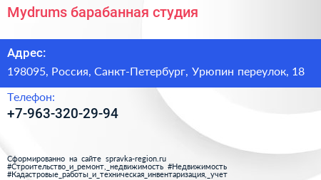 Mydrums, барабанная студия по адресу 198095, Россия, Санкт-Петербург, Урюпин переулок, 18 в дальнейшем Организация, размещена в следующих категориях: