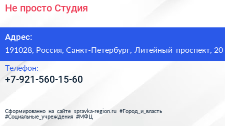 Не просто Студия по адресу 191028, Россия, Санкт-Петербург, Литейный проспект, 20 в дальнейшем Организация, размещена в следующих категориях: