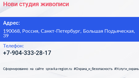 Нови, студия живописи по адресу 190068, Россия, Санкт-Петербург, Большая Подьяческая, 39 в дальнейшем Организация, размещена в следующих категориях: