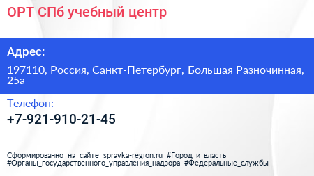 ОРТ-СПб, учебный центр по адресу 197110, Россия, Санкт-Петербург, Большая Разночинная, 25а в дальнейшем Организация, размещена в следующих категориях: