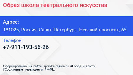 Образ, школа театрального искусства по адресу 191025, Россия, Санкт-Петербург, Невский проспект, 65 в дальнейшем Организация, размещена в следующих категориях: