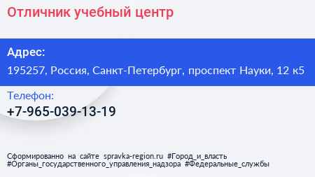 Отличник, учебный центр по адресу 195257, Россия, Санкт-Петербург, проспект Науки, 12 к5 в дальнейшем Организация, размещена в следующих категориях: