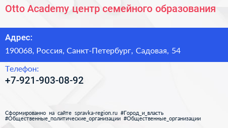 Otto Academy, центр семейного образования по адресу 190068, Россия, Санкт-Петербург, Садовая, 54 в дальнейшем Организация, размещена в следующих категориях:
