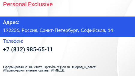 Personal Exclusive по адресу 192236, Россия, Санкт-Петербург, Софийская, 14 в дальнейшем Организация, размещена в следующих категориях: