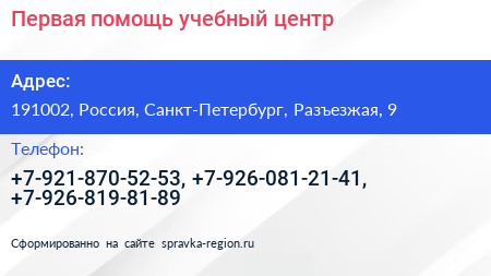 Первая помощь, учебный центр по адресу 191002, Россия, Санкт-Петербург, Разъезжая, 9 в дальнейшем Организация, размещена в следующих категориях:
