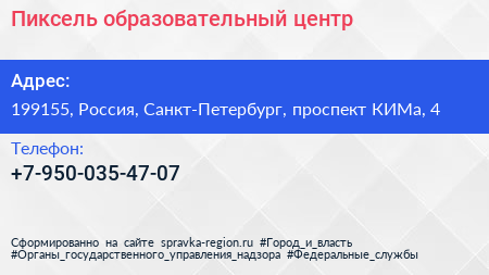 Пиксель, образовательный центр по адресу 199155, Россия, Санкт-Петербург, проспект КИМа, 4 в дальнейшем Организация, размещена в следующих категориях: