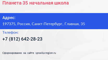 Планета 35, начальная школа по адресу 197375, Россия, Санкт-Петербург, Главная, 35 в дальнейшем Организация, размещена в следующих категориях: