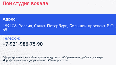 Пой!, студия вокала по адресу 199106, Россия, Санкт-Петербург, Большой проспект В.О., 65 в дальнейшем Организация, размещена в следующих категориях: