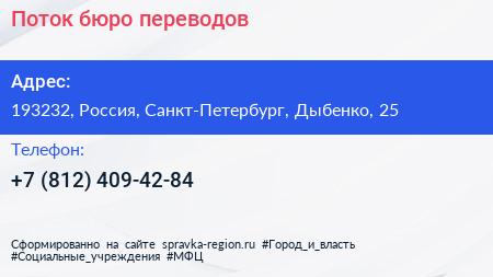 Поток, бюро переводов по адресу 193232, Россия, Санкт-Петербург, Дыбенко, 25 в дальнейшем Организация, размещена в следующих категориях: