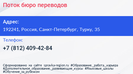 Поток, бюро переводов по адресу 192241, Россия, Санкт-Петербург, Турку, 35 в дальнейшем Организация, размещена в следующих категориях: