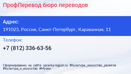 ПрофПеревод, бюро переводов по адресу 191023, Россия, Санкт-Петербург, Караванная, 11 в дальнейшем Организация, размещена в следующих категориях: