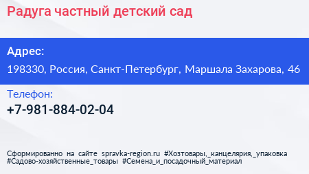 Радуга, частный детский сад по адресу 198330, Россия, Санкт-Петербург, Маршала Захарова, 46 в дальнейшем Организация, размещена в следующих категориях: