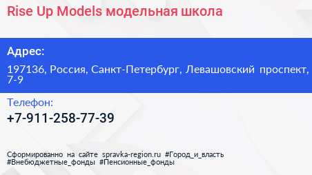 Rise Up Models, модельная школа по адресу 197136, Россия, Санкт-Петербург, Левашовский проспект, 7-9 в дальнейшем Организация, размещена в следующих категориях: