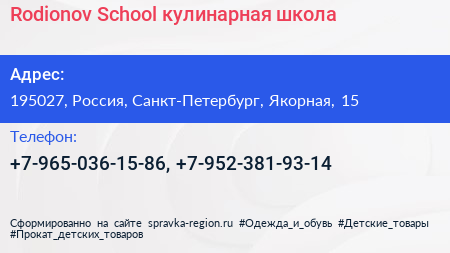 Rodionov School, кулинарная школа по адресу 195027, Россия, Санкт-Петербург, Якорная, 15 в дальнейшем Организация, размещена в следующих категориях:
