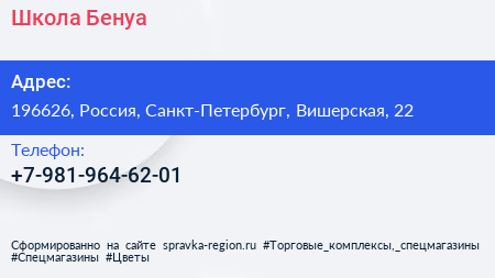 Школа Бенуа по адресу 196626, Россия, Санкт-Петербург, Вишерская, 22 в дальнейшем Организация, размещена в следующих категориях: