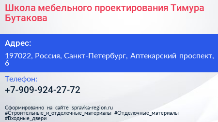 Школа мебельного проектирования Тимура Бутакова по адресу 197022, Россия, Санкт-Петербург, Аптекарский проспект, 6 в дальнейшем Организация, размещена в следующих категориях: