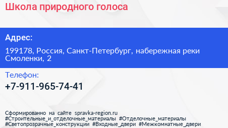 Школа природного голоса по адресу 199178, Россия, Санкт-Петербург, набережная реки Смоленки, 2 в дальнейшем Организация, размещена в следующих категориях:
