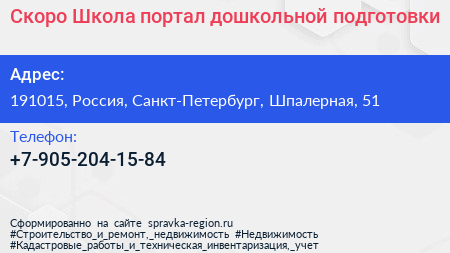 Скоро Школа, портал дошкольной подготовки по адресу 191015, Россия, Санкт-Петербург, Шпалерная, 51 в дальнейшем Организация, размещена в следующих категориях: