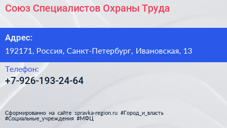 Союз Специалистов Охраны Труда по адресу 192171, Россия, Санкт-Петербург, Ивановская, 13 в дальнейшем Организация, размещена в следующих категориях: