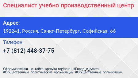 Специалист, учебно-производственный центр по адресу 192241, Россия, Санкт-Петербург, Софийская, 66 в дальнейшем Организация, размещена в следующих категориях: