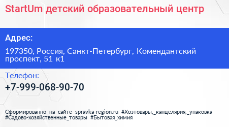 StartUm, детский образовательный центр по адресу 197350, Россия, Санкт-Петербург, Комендантский проспект, 51 к1 в дальнейшем Организация, размещена в следующих категориях: