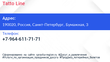 Tatto Line по адресу 190020, Россия, Санкт-Петербург, Бумажная, 3 в дальнейшем Организация, размещена в следующих категориях: