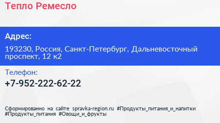 Тепло-Ремесло по адресу 193230, Россия, Санкт-Петербург, Дальневосточный проспект, 12 к2 в дальнейшем Организация, размещена в следующих категориях: