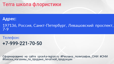 Terra, школа флористики по адресу 197136, Россия, Санкт-Петербург, Левашовский проспект, 7-9 в дальнейшем Организация, размещена в следующих категориях: